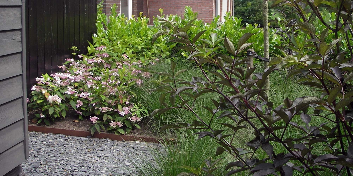 In het beplantingsplan voeren de siergrassen de boventoon gecombineerd met sterke vaste planten. De grassen komen repeterend terug, omdat het bijzonder goed past bij het corten-stiel, geschikt is als contrast t.o.v. de donkere houten wanden en het geeft de beplanting een weelderig beeld. Zijn fijne textuur ruist bij alle winden en het vangt, naarmate zijn wintersilhouet vordert, de lage herfst- en winterzon oogstrelend op.